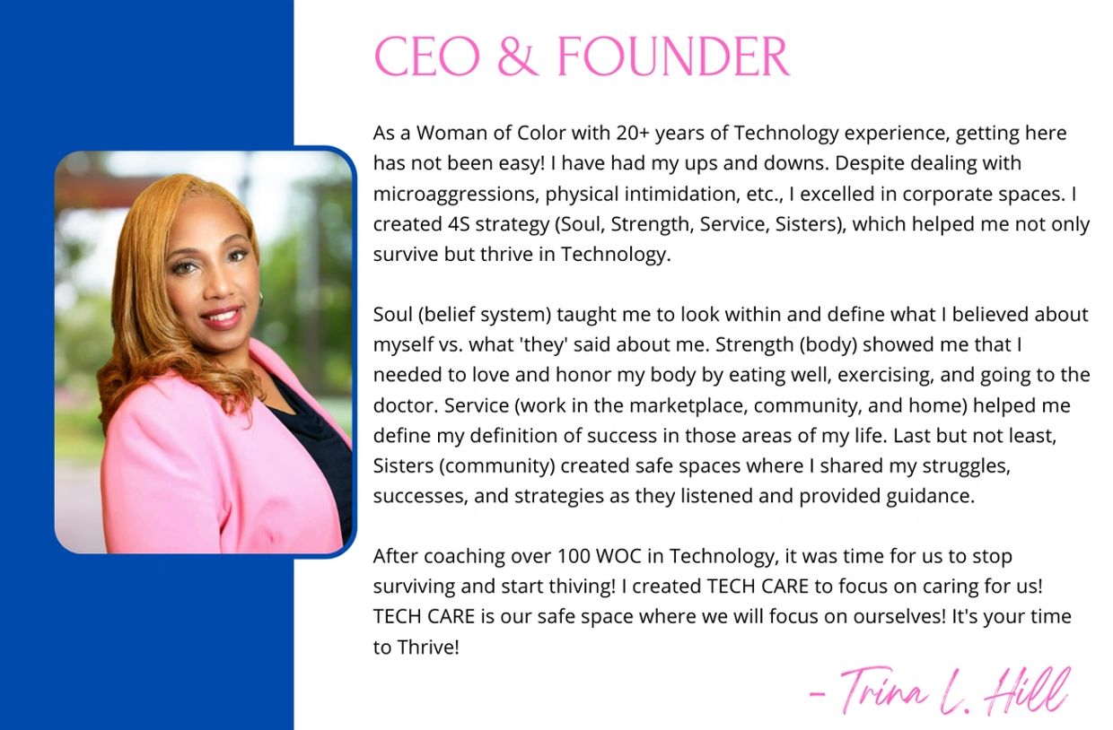 Are you ready to reach your fullest potential? TECH CARE for Women of Color offers coaching, community, and compassion to help you achieve self-discovery and transformative growth. Join us in creating a safe space of love and healing, an environment where we empower each other through our stories and learn to be our best selves. With TECH CARE of Women of Color, together we can show the world the power of a vibrant community. Don't wait any longer - join us today!